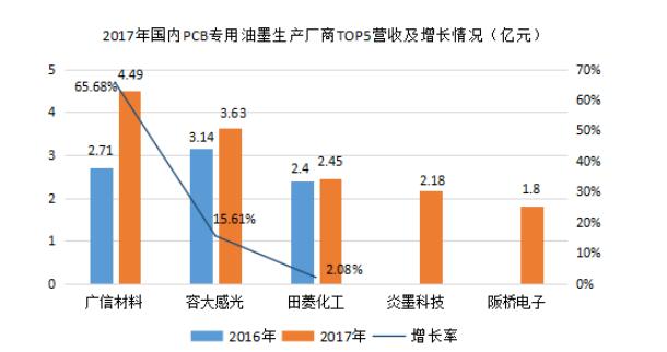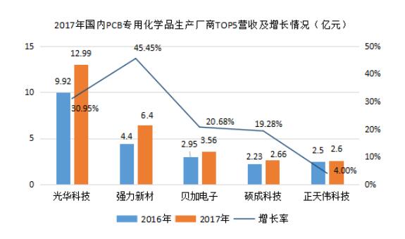 國內PCB專用化學品龍頭生產企業為廣東光華科技股份有限公司,以“高性能電子化學品”、“高品質化學試劑”和“新能源材料”為主導深耕于PCB領域;2017年營收為12.99億元,占比高達30.95%,其中PCB化學品占營收比重超過50%,為58.97%。