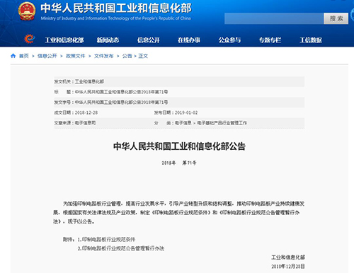 【PCB信息網】據工業和信息化部1月2日消息,為加強印制電路板行業管理,提高行業發展水平,引導產業轉型升級和結構調整,推動印制電路板產業持續健康發展,根據國家有關法律法規及產業政策,工業和信息化部制定《印制電路板行業規范條件》和《印制電路板行業規范公告管理暫行辦法》,現予以公告。