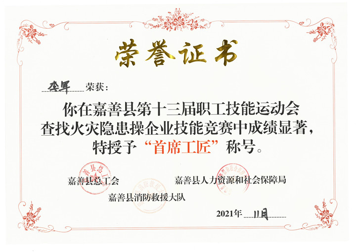 熱烈祝賀公司李軍榮獲嘉善縣第十三屆職工技能運(yùn)動會查找火災(zāi)隱患操企業(yè)技能賽“首席工匠”