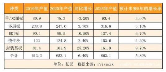 2021年PCB行業預計成長率為8.6%,并將在2020至2025年之間以5.8%的年復合增長率成長,到2025年全球PCB行業產值將達到863.3億美元。