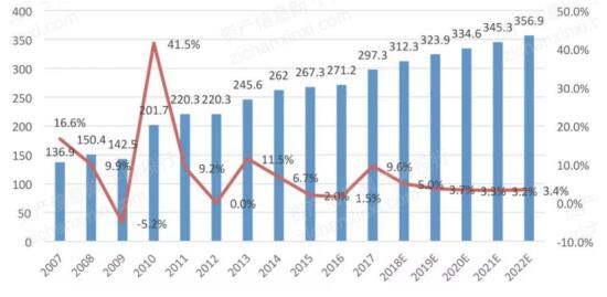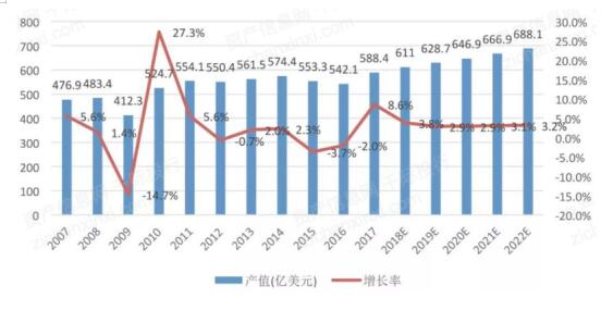 圖 2007-2022 年國內(nèi)PCB產(chǎn)值及增長率