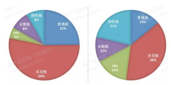 圖 2000(左)與2017(右)PCB細分產(chǎn)品占比