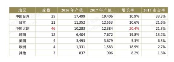 2017年全球產(chǎn)值1億美元以上的企業(yè)共115家,百強總產(chǎn)值581.8億美元;2017年,中國內(nèi)資在全球百強中的數(shù)量持續(xù)上升,已達46家;臺灣(25);日本(21),中國內(nèi)資在全球百強中的總產(chǎn)值(123.8億美元,年增長率達20.4%,為各國家/地區(qū)最高)和日本已很接近(125.5億),預(yù)計2018年中國內(nèi)資總產(chǎn)值將超越日本;中國企業(yè)上榜企業(yè)數(shù)量為46家,占21.3%,市場份額僅次于中國臺灣的33.3%和日本的21.6%。