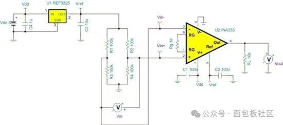 圖 2 是我用來展示焊劑污染所造成結果的測試電路。由2.5V 參考電壓激活的平衡惠斯頓接橋網絡可仿真高阻抗橋接傳感器。差分橋接傳感器輸出VIN+ - VIN- 可連接至增益為101V/V的 INA333。在理想狀態下,由于橋接處于平衡狀態,因而VIN+ - VIN- = 0V。但焊劑污染會造成實際橋接傳感器電壓隨時間慢慢漂移。