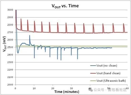 從圖3中可以看出,焊劑污染對橋接傳感器輸出性能有嚴重的影響。在未清潔或手工清洗的情況下,橋接傳感器電壓從未達到約 VREF/2的預期電壓,即便在一小時趨穩時間之后。此外,未清潔電路板還表現出大量外部噪聲收集。在使用超聲波浴清洗并完全干燥后,橋接傳感器電壓穩如磐石。
