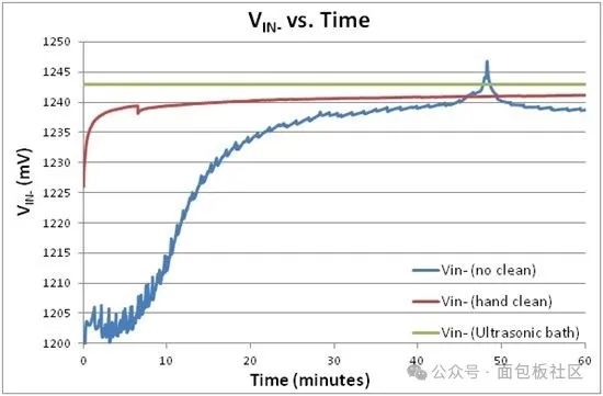 在本次測試中,裝配后我同時記錄了不同程度清潔之后 VIN- 和VOUT 一小時的變動情況: