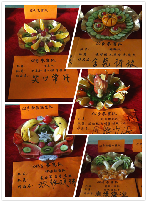 下午兩點,比賽在公司食堂正式開始。大家信心滿滿,準備在一個小時內大顯身手。團委為各組參賽隊準備的蘋果、桔子、西瓜、番茄、香蕉、黃瓜、火龍果、提子、橙子、獼猴桃等等各種水果在一雙雙巧手下進行著華麗變身,大家輕聲交談,配合協作,現場氣氛十分愉悅。半個小時之后,凝聚了隊員心血的各種造型的水果拼盤紛紛出爐,并且都有了一個個或動人或新穎或可愛的名字:“笑口常開”、“含苞待放”、“浪漫海濱”、“雙豚戲珠”、“烏龜戲水”等等,更有“鮮花插在牛糞上”等令人忍俊不禁的名字。完成后的作品一字擺上了鋪有紅絲絨布的長桌,靜靜迎接著大家的參觀和評論。