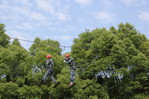 最后一個拓展項目為“飛奪瀘定橋”,這個項目中鍛煉的是克服個人心理恐懼,在逆境中尋求出路,挑戰(zhàn)自我。在高空中,穿越由若干個由鋼絲并連起來的木板搭建的懸橋,以最快的速度跑過,從而到達勝利的彼岸。在這個項目中,我告訴自己不要怕,勇于嘗試,才能發(fā)現平時生活中看不到自己的另一面。“睜大眼,握緊索道,快步走過”,事后想想,原來我的膽量并非想象中的小,呵呵……