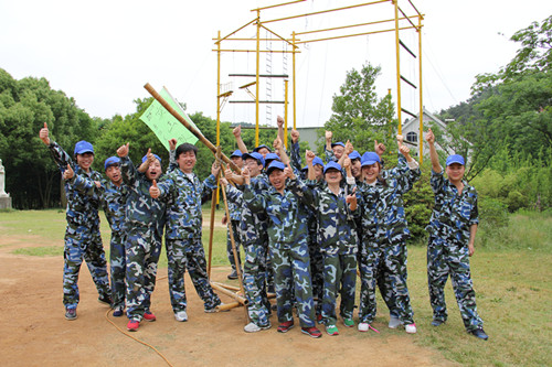 整裝待發(fā),在教導員的號令下,整齊劃一,等待教練員的指揮。拓展的開始,由三個小小的熱身游戲展開。第一個為“十秒擊掌”,在十秒時間內計算出自己的擊掌次數。游戲中的感悟是:無論生活還是工作中,都不能低估自身能力,相信自己,為自己點贊。第二個為“隊友間握手示好”,隊員之間相互握手,游戲中感悟的是:工作、生活中我們的伙伴并不局限于我們的左右手,身邊的同事、朋友都將是我們的良師益友;第三個為“拉圈互坐”,游戲中感悟的是:在團隊的配合中,要明白團隊的重要性,不個人思想、不脫離群體。三個互動游戲的熱身,都是在告訴我們,團隊的協作精神,這也是我們今天拓展的目的。游戲結束后,“選隊長、隊花、隊名、口號、隊歌”兩支競爭隊伍“突擊隊”、“野狼隊”誕生了。我屬于野狼隊的隊員。下面我就簡單講述一下在拓展項目中的領悟與大家分享!