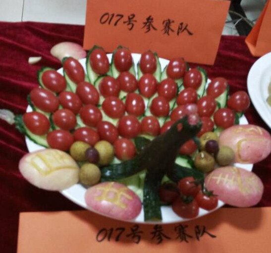 我們團(tuán)隊(duì)分工明確,合作默契。康貴霞負(fù)責(zé)刻孔雀開屏四個(gè)大字和孔雀的頭,馮冬梅負(fù)責(zé)切黃瓜,王文靜負(fù)責(zé)切小番茄,我負(fù)責(zé)擺盤。緊張激烈的比賽時(shí)間總是過得很快,不過我們還是在規(guī)定的時(shí)間完成了作品。自我肯定也是提升團(tuán)隊(duì)自信的一個(gè)因素。完成作品后,我們欣賞了別的小組的作品,形態(tài)各異。當(dāng)每個(gè)小組都完成作品后,各自拿到參展臺(tái)進(jìn)入拉票投票環(huán)節(jié),投票后分出前三名。每個(gè)小組共有六票,派出一名代表進(jìn)行投票,投票過后對(duì)每個(gè)小組的票進(jìn)行匯總。經(jīng)過緊張的投票環(huán)節(jié),我們快樂團(tuán)隊(duì)最終以13票獲得了第二名。
