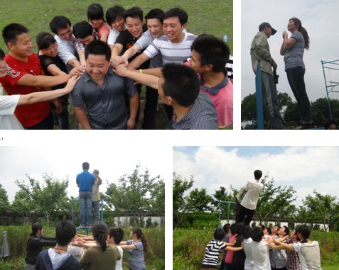 工程部 張維霞——在4米高的畢業(yè)墻面前,二個(gè)小團(tuán)隊(duì)合并成一個(gè)大團(tuán)隊(duì),競爭沒有了,只剩下合作。經(jīng)過討論,我們找到了爬畢業(yè)墻的方法:高個(gè)隊(duì)員站在魁梧高大的墊底隊(duì)員肩上,再由第二輪隊(duì)員托舉高個(gè)隊(duì)員的腳,使其可以伸手夠到墻頂,努力爬到墻上,再把下一位隊(duì)員拉上來,其余隊(duì)員圍在墻下,雙臂彎曲呈托舉狀,作保護(hù)人墻,隊(duì)員都爬過墻了,最后一個(gè)隊(duì)員是上面的一個(gè)隊(duì)員倒立用手拉住最后一個(gè)隊(duì)員然后被墻上的隊(duì)員拉上來了。31個(gè)隊(duì)員以11分40秒的好成績成功了。我們這些中間爬上墻頂?shù)年?duì)員們,看著墊底隊(duì)員因被踩而紅紅的肩膀,衷心感謝他們的付出和犧牲;看著先驅(qū)隊(duì)員因拉人而酸痛的胳膊,感謝他們的勇氣和力量;互相感謝著,為了給予別人的支持,為了團(tuán)隊(duì)合作的成功,為了相互的信任,為了超越了的自己。
