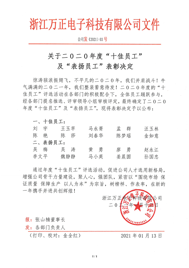 關于二O二O年度“十佳員工”及“表揚員工”表彰決定