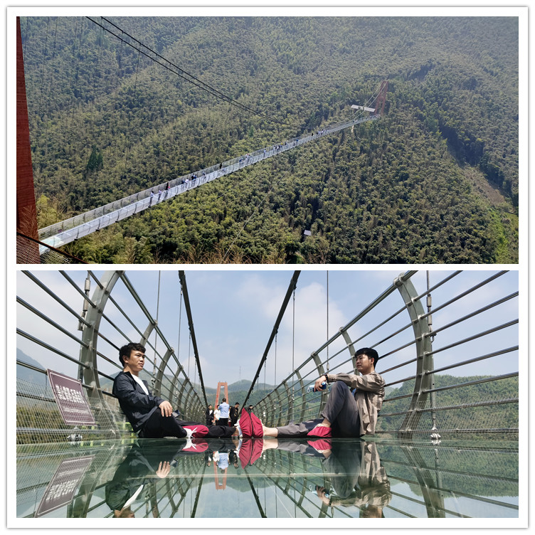 小爬坡穿梭一段竹林后,便來到了中國最長的竹海玻璃天橋,它橫跨兩座高山,全長468米,離地面高度107米。站在全透明的玻璃棧道上,有種“人在空中走、景在腳下游”的懸空萬丈之感。有的因恐高,膽小害怕,不敢前行、往下看,直呼站在上面有種腿抖的感覺;有的膽大的,他們從容淡定,勇往直前。還一直鼓勵不敢走的同事,手扶欄桿,雙限遠眺,盡量不往下看,用這種方式趕走膽怯的心。這么壯麗的美景怎么舍得不拍照?他們有坐在天橋中央的、有各種凹造型的、有花樣搞怪的、還有相互合影的,一幅幅歡快的畫面將這份美好與美景定格在此。同時這也正是我們尋找優秀攝影師的最好出處,攝影師們一身蓄勢以發的氣勢,等待他們的將是最終的攝影大PK。