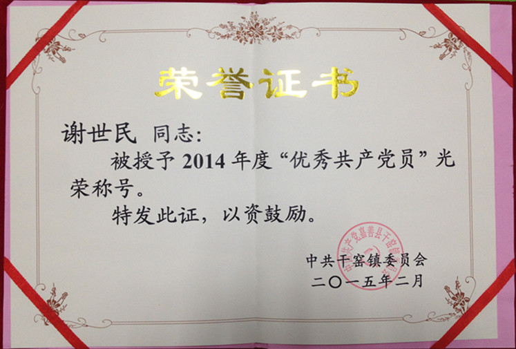 熱烈祝賀我公司謝世民同志被中共干窯鎮(zhèn)委員會授予2014年度“優(yōu)秀共產(chǎn)黨員”光榮稱號
