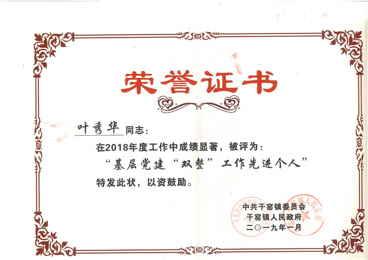 熱烈祝賀公司葉秀華同志被中共干窯鎮委員會授予2018年度基層黨建“雙整”工作先進個人光榮稱號