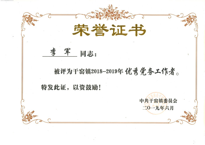熱烈祝賀公司李軍同志被中共干窯鎮委員會授予2018-2019年度“優秀黨務工作者“光榮稱號