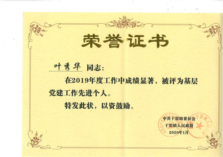 熱烈祝賀公司葉秀華同志被中共干窯鎮委員會授予2019年度“基層黨建工作先進個人”光榮稱號