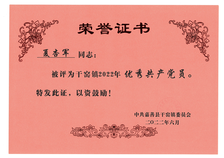 熱烈祝賀公司夏杏軍同志榮獲干窯鎮2022年“優秀共產黨員”
